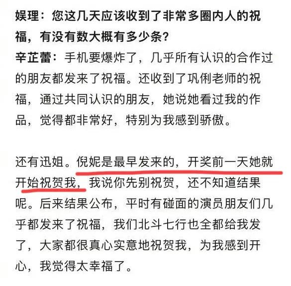 当初辛芷蕾拿奖经受采访时,就曾示意圈内好友中,倪妮是第一个发讯息祈福她的。